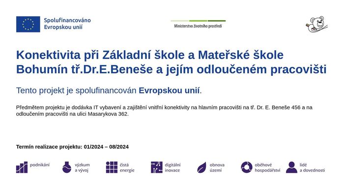 Základní škola a Mateřská škola Bohumín tř.Dr.E.Beneše 456 okres Karviná, příspěvková organizace za finanční podpory Evropské unie realizuje projekt „Konektivita při Základní škole a Mateřské škole Bohumín tř.Dr.E.Beneše a jejím odloučeném pracovišti“, který řeší dodávku IT vybavení a zajištění vnitřní konektivity na hlavním pracovišti na tř. Dr. E. Beneše 456 a na odloučením pracovišti na ulici Masarykova 362.